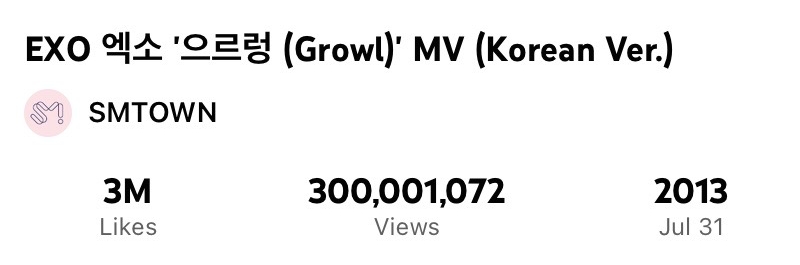 EXO 最初于 2013 年 8 月 1 日发布了《Growl》的音乐视频,这意味着这首歌只用了 10 年零两个月零六天的时间就达到了这一里程碑。