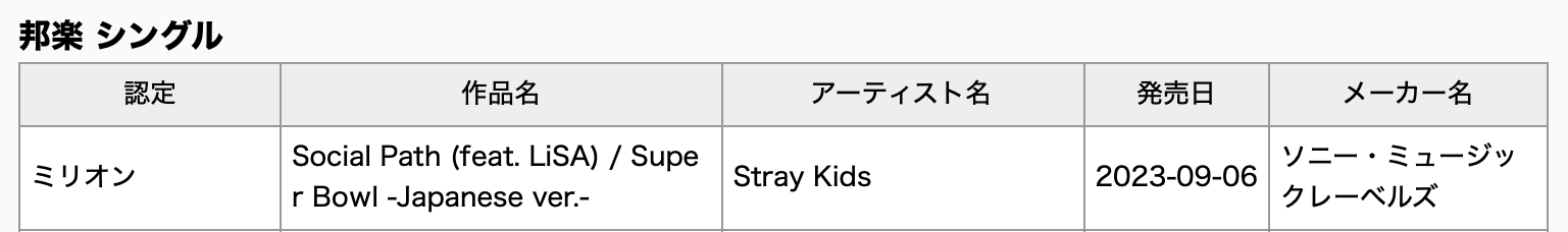 Stray Kids 的新日本 EP 《Social Path (feat. LiSA) / Super Bowl – Japanese ver.-》 凭借超过 100 万张的出货量获得官方百万认证,成为他们在日本首次实现这一壮举的专辑。根据RIAJ的认证门槛,销量达到10万张即可获得黄金专辑认证,销量达到25万张即可获得白金专辑认证,销量达到100万张即可获得百万张专辑认证。