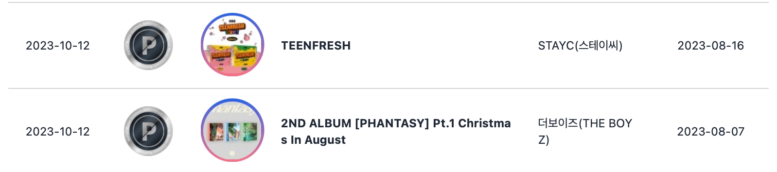 此外,STAYC的《TEENFRESH》、THE BOYZ的《PHANTASY: Pt.1 Christmas in August》和PLAVE的《ASTERUM : The Shape of Things to Come》均以超过25万张的销量获得白金认证。