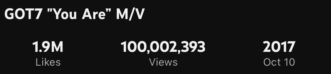 GOT7最初于2017年10月10日发布了《You Are》的音乐视频,这意味着这首歌花了六年零十天的时间才突破一亿大关。