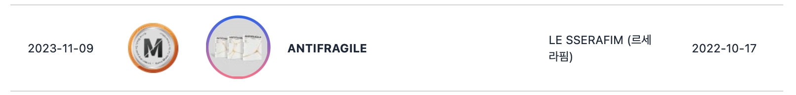 与此同时,LE SSERAFIM的2022年迷你专辑《ANTIFRAGILE》成为该团体第二张获得百万销量认证的专辑(继最新专辑《UNFORGIVEN》之后)。