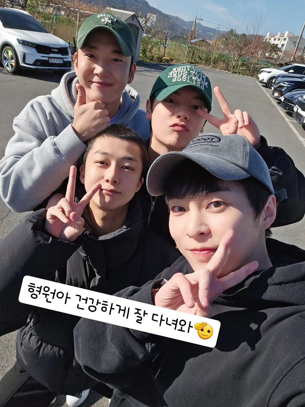 MONSTA X在其官方X帐户上分享了Shownu、I.M和Hyungwon的《CEO-dol Mart》联合主演Xiumin、崔元明和李世温在军事训练中心送Hyungwon的照片。其中一篇帖子包含 Hyungwon 的留言,他写道:“一如既往,我将努力工作并保持健康。我会做得很好,当我回来时,我会足够坚强和可靠,可以轻松挡住风。到时候我们热烈地互相打招呼吧。”