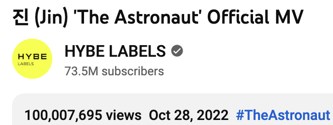 《The Astronaut》是 Jin 继他的个人歌曲《Epiphany》(BTS 的《LOVE YOURSELF: Answer》的复出预告片)视频后第二个达到 1 亿观看次数的个人视频。
