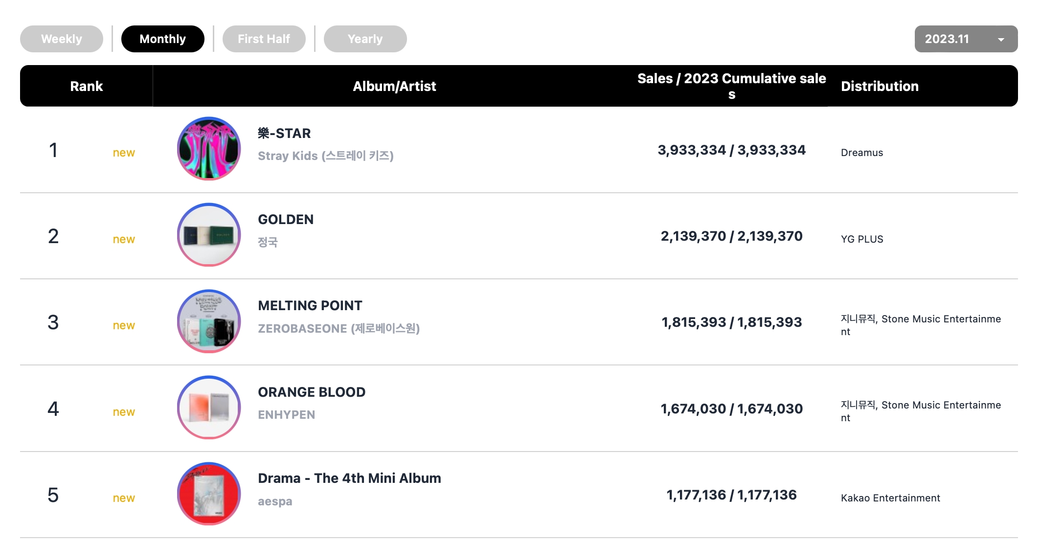 Stray Kids 凭借新迷你专辑《ROCK-STAR》登上 11 月实体专辑榜榜首,并首次登上第一名。