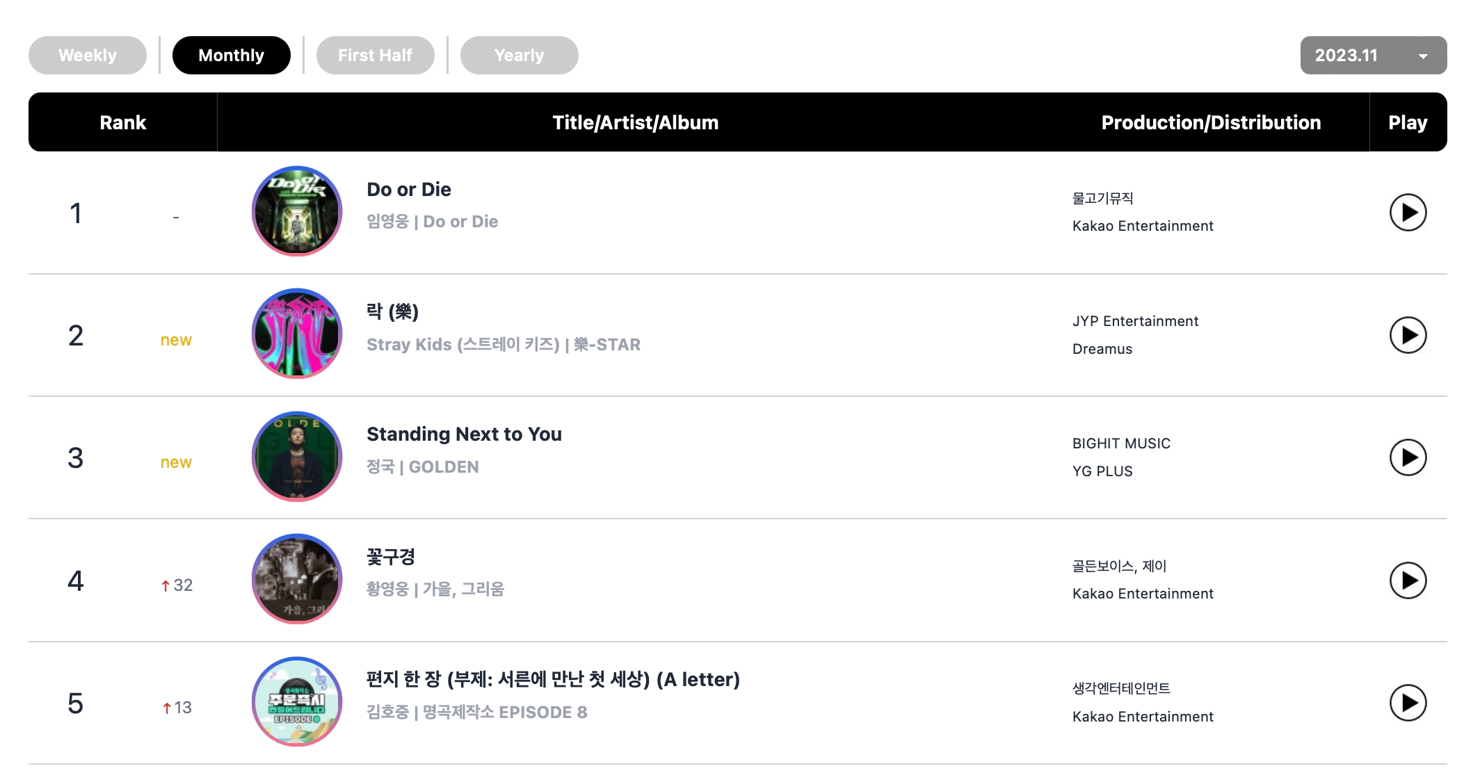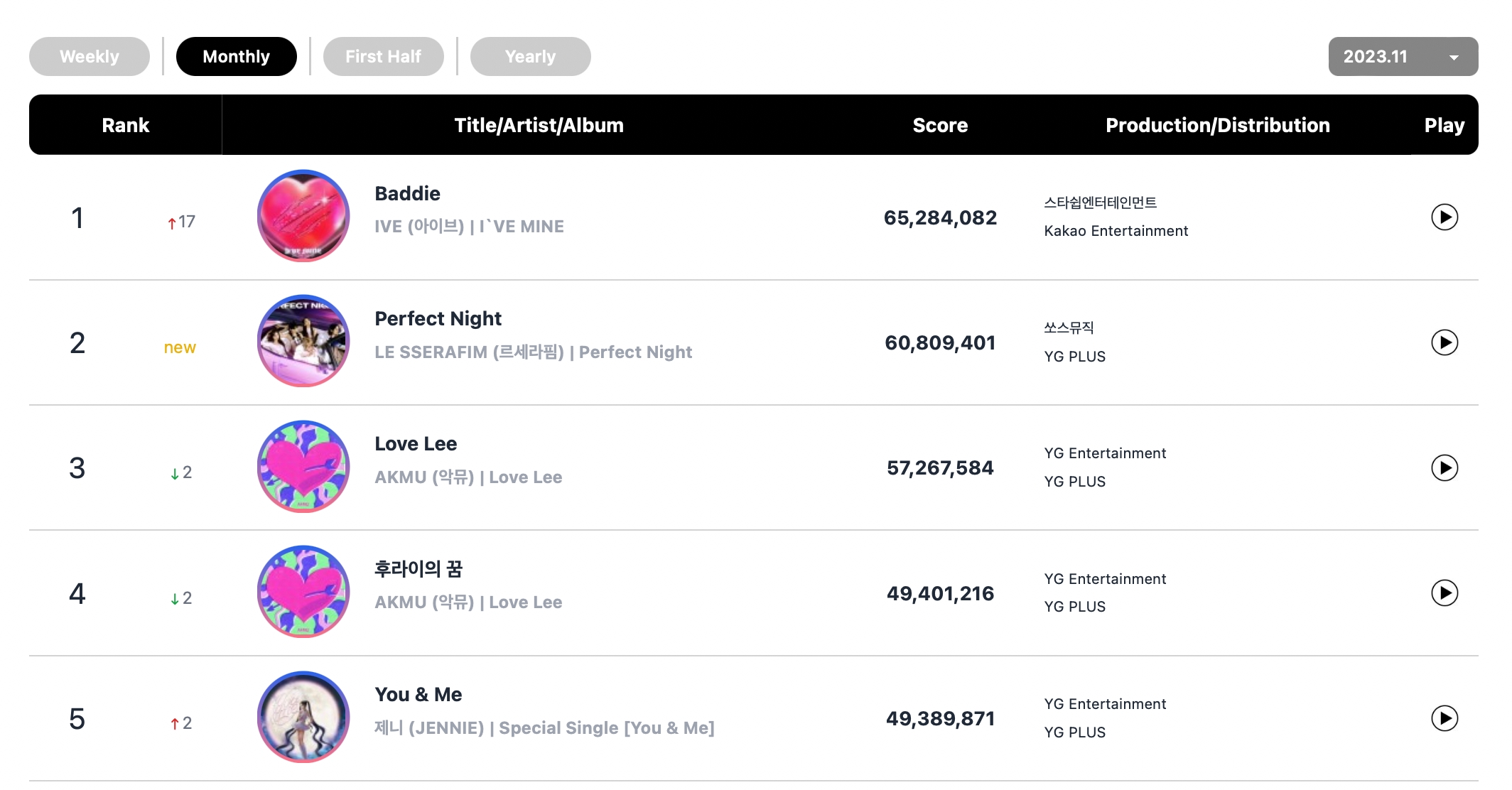 IVE 的《Baddie》位居 11 月流媒体排行榜榜首,其次是 AKMU 的《Love Lee》排名第二,LE SSERAFIM 的《Perfect Night》排名第三,AKMU 的《Fry’s Dream》排名第四,Jennie 的《你和我”排名第五。