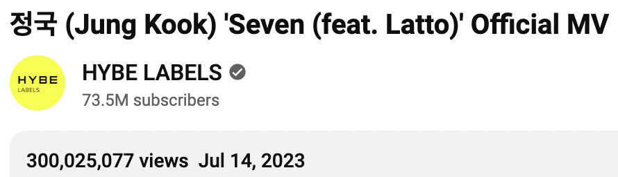 《Seven》是继 Jisoo 的《FLOWER》之后,2023 年迄今为止第二个点击量突破 3 亿次的韩国流行音乐视频。