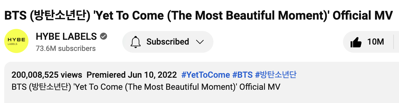 BTS 的《Yet To Come》音乐视频于 12 月 19 日下午 2 点左右观看次数突破 2 亿次。 KST,自2022年6月10日下午1点发布音乐视频以来,花了大约一年六个月零九天的时间才实现这一壮举。韩国时间。
