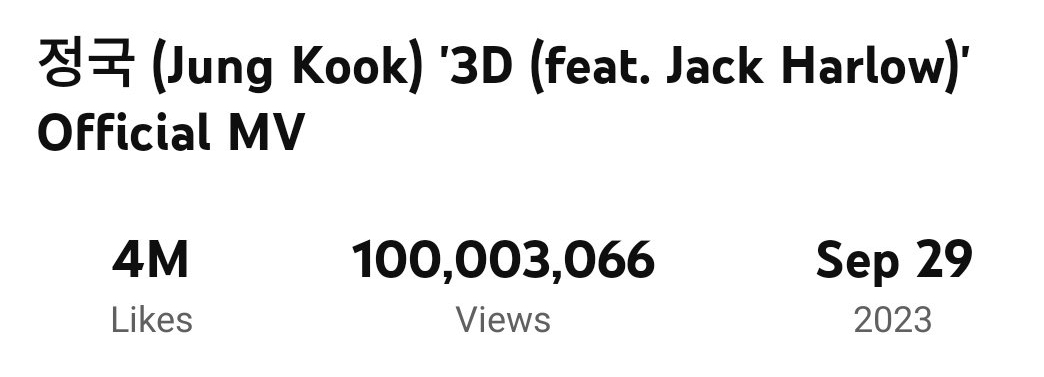 韩国标准时间 12 月 22 日凌晨 2:45 左右,柾国的个人单曲“3D”(与 Jack Harlow 合作)的音乐视频在 YouTube 上的观看次数突破了 1 亿次。