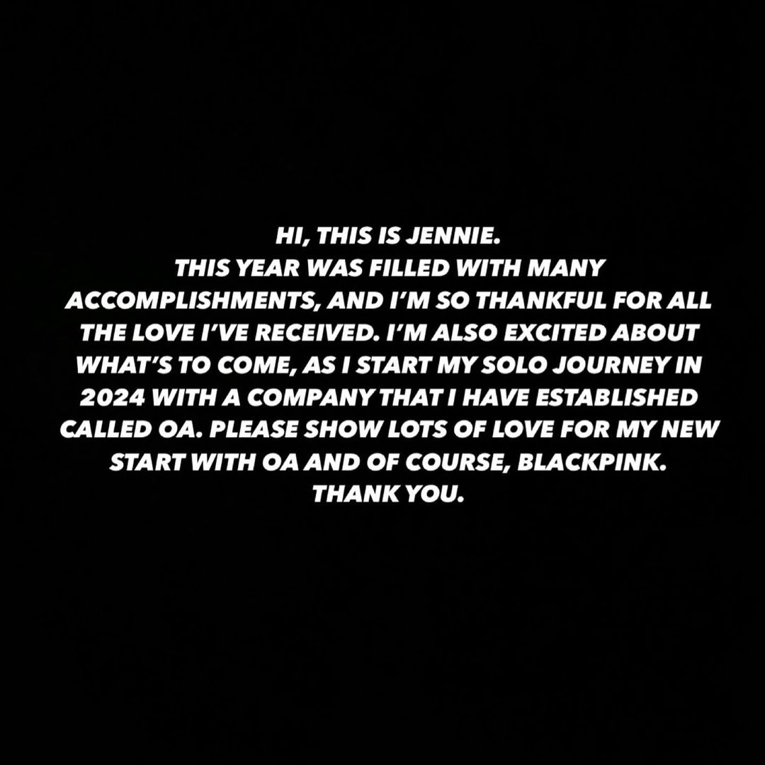 今年充满了许多成就,我非常感谢我收到的所有爱。我也对即将发生的事情感到兴奋,因为我将于 2024 年与我创建的一家名为 OA 的公司开始我的个人旅程。请大家多多关爱我与 OA,当然还有 BLACKPINK 的新开始。