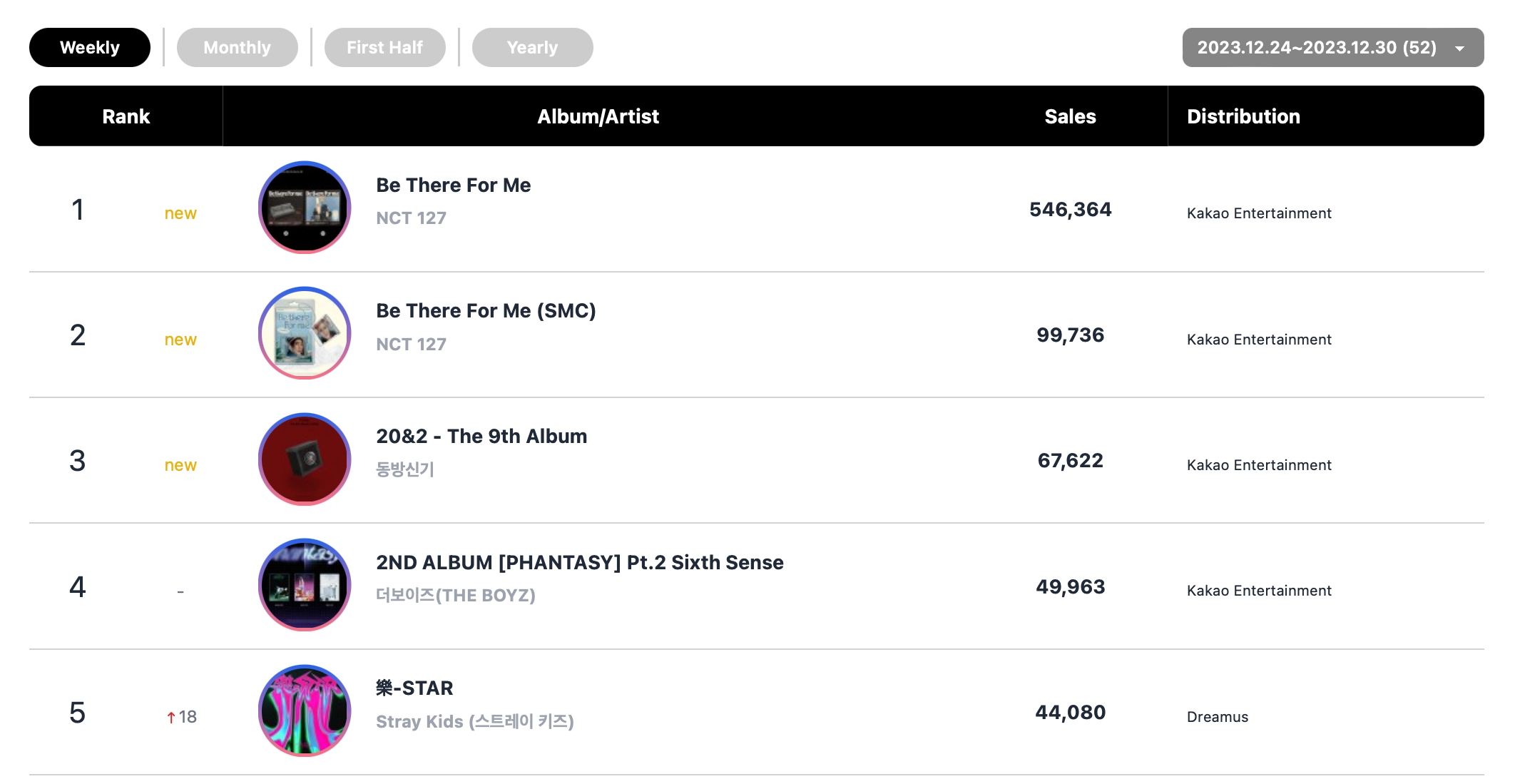 NCT 127凭借新单曲横扫本周实体专辑榜前两名:普通版《Be There For Me》首发第一名,SMC版则登上第一名。 2.