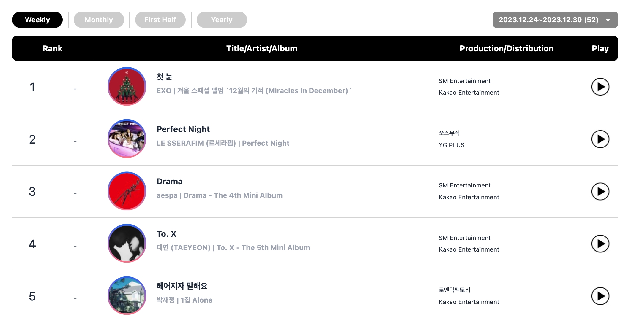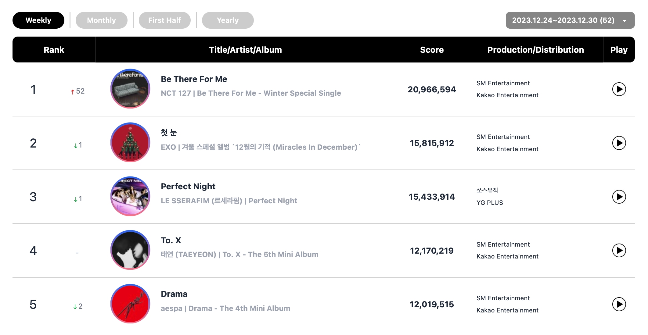 Circle Chart(以前称为 Gaon Chart)公布了 12 月 24 日至 30 日当周的排行榜!