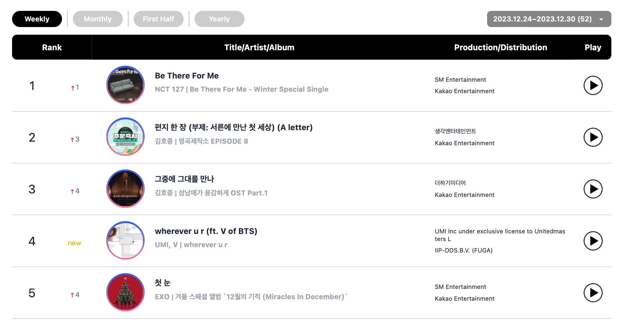 BTS 的 V 与 UMI 的新合作歌曲《Wherever u r》首次亮相就在排行榜上排名第四,而 EXO 的《First Snow》则攀升至第五位。