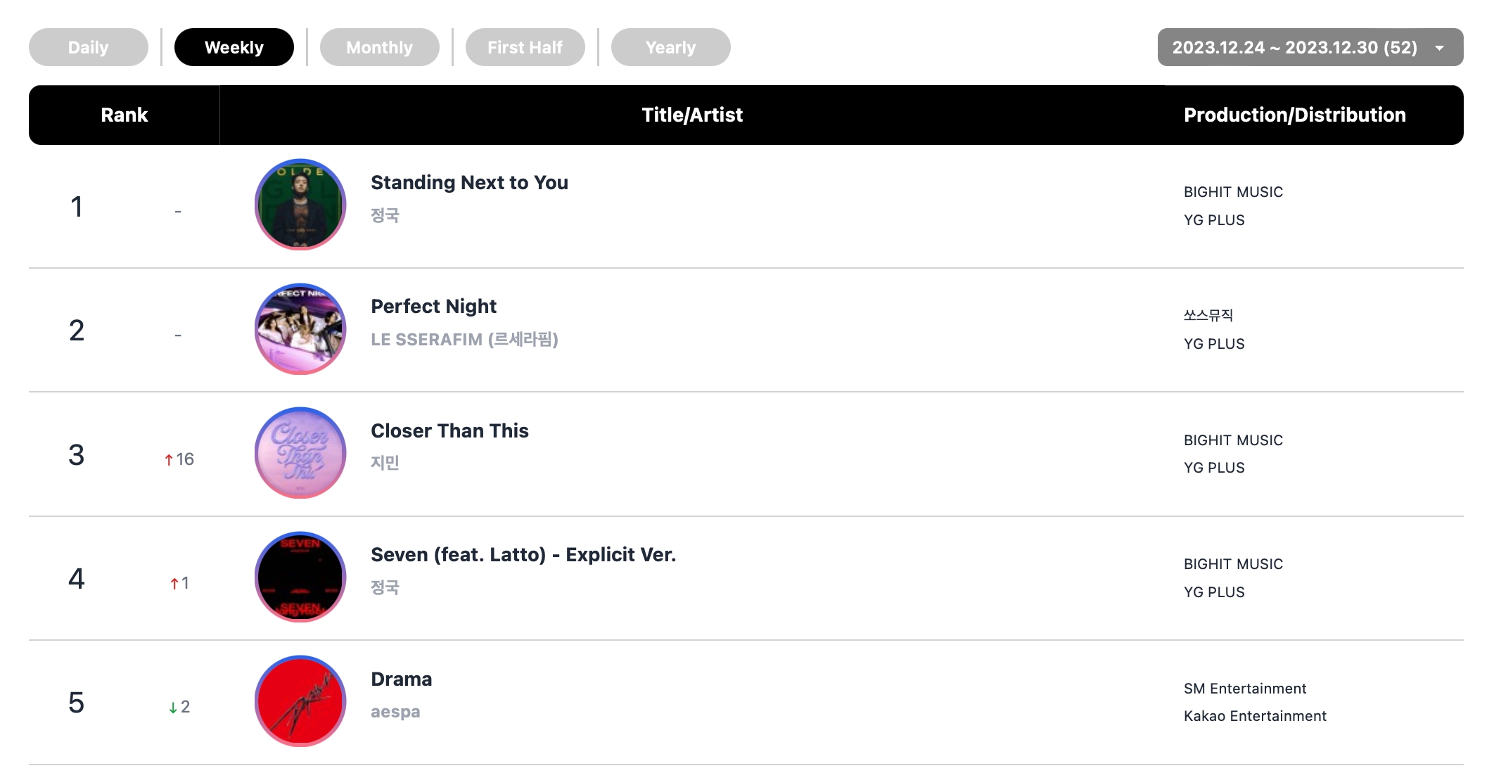 BTS 的 Jimin 的新单曲“Closer Than This”本周跃居第三位,Jungkook 的“Seven”(与 Latto 合作)的露骨版本紧随其后,排名第四,aespa 的“Drama”排名第五。