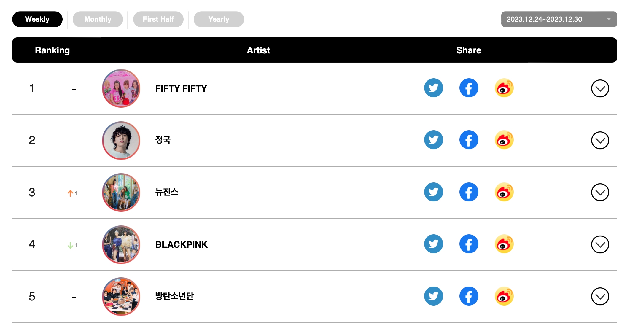 FIFTY FIFTY 本周在社交排行榜上保持第一,紧随其后的是 Jungkook,排名第二,NewJeans 排名第三,BLACKPINK 排名第四,BTS 排名第五。