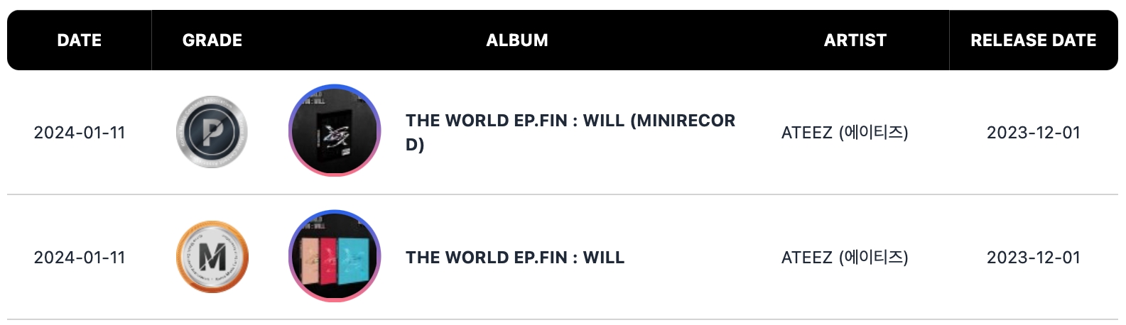 ATEEZ 的新专辑“THE WORLD EP.FIN : WILL”同样获得了两项单独的 Circle 认证——普通版专辑的百万级认证(销量超过 100 万张)和 MINIRECORD 版本的白金认证(已售出超过 250,000 份)。