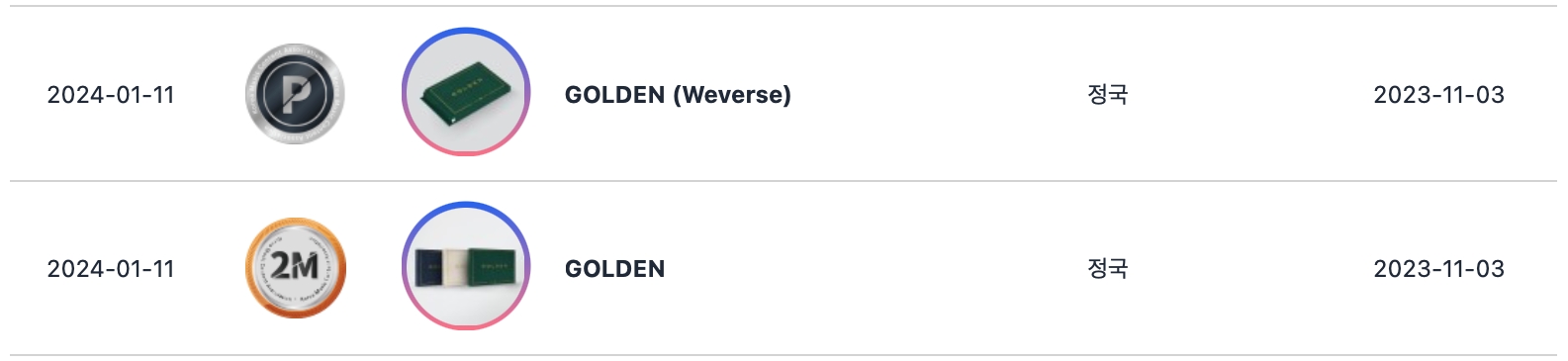 与此同时,BTS 的 Jungkook 因其个人首张专辑《GOLDEN》获得了两项单独的 Circle 认证。他不仅获得了普通版专辑的双百万认证(销量超过200万张),而且Weverse版本的专辑也获得了白金认证(销量超过25万张)。