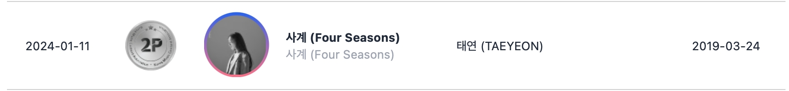 在流媒体类别中,少女时代泰妍的 2019 年个人单曲《四季》在超过 2 亿次流媒体播放后获得双白金认证。