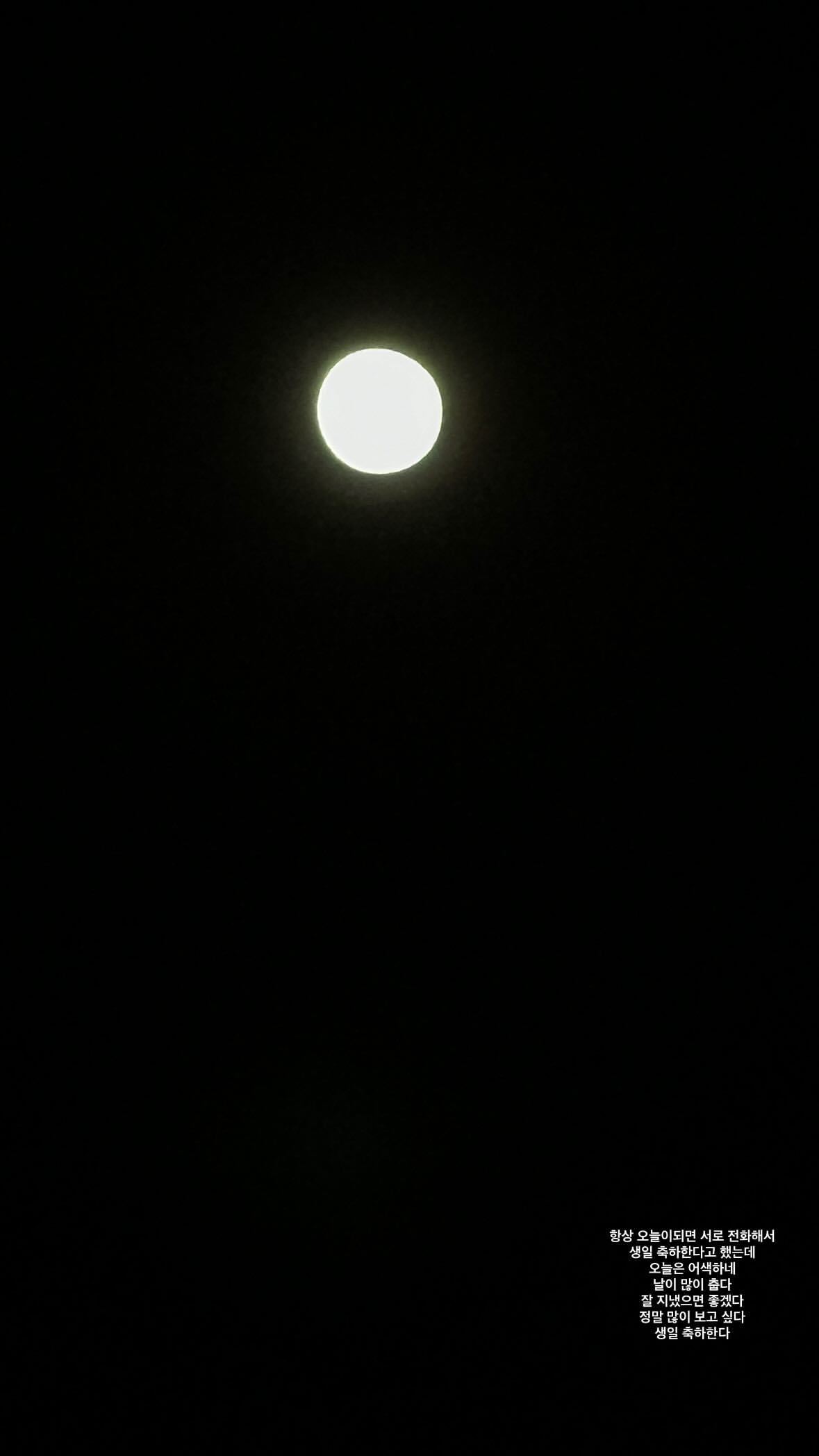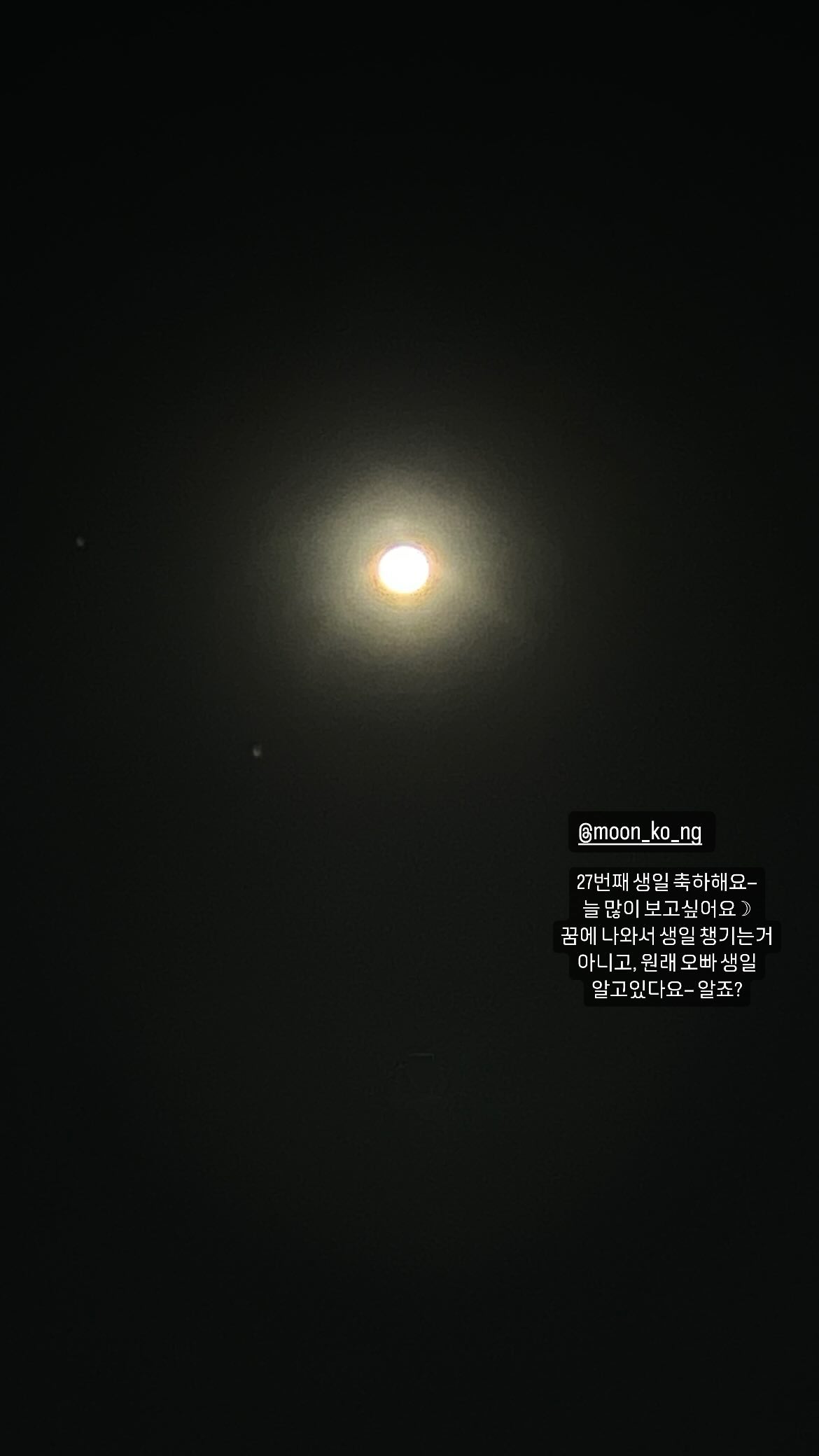 与文彬同一天生日的MONSTA X成员I.M发布了一张月亮照片,并写道:“我们总是在这一天互相打电话,祝对方生日快乐,但今天感觉很尴尬。天气非常冷。我希望你一切都好。我真的很想念你。生日快乐。”