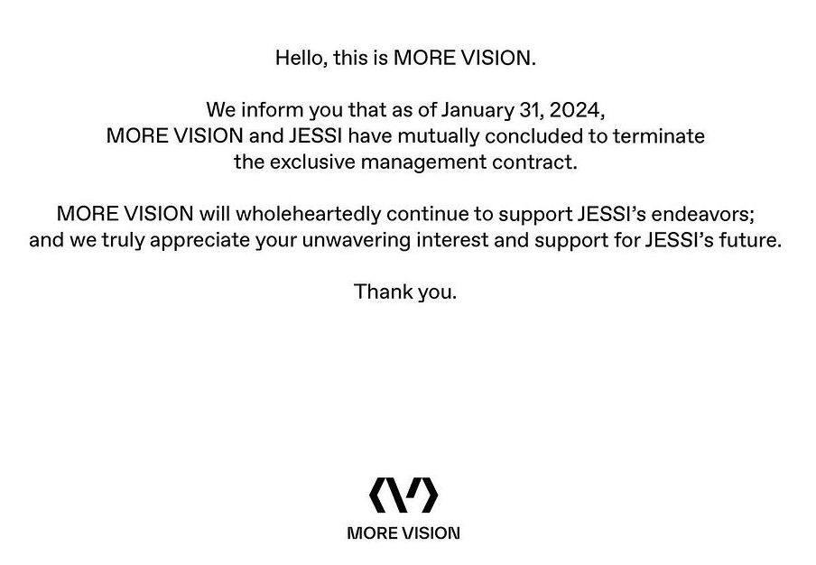1月31日,Jessi经纪公司MORE VISION宣布与Jessi解除专属合约,具体如下: