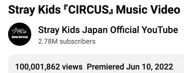 《CIRCUS》是 Stray Kids 的第 12 支团体音乐视频,也是他们首个观看次数突破 1 亿次的日本音乐视频。