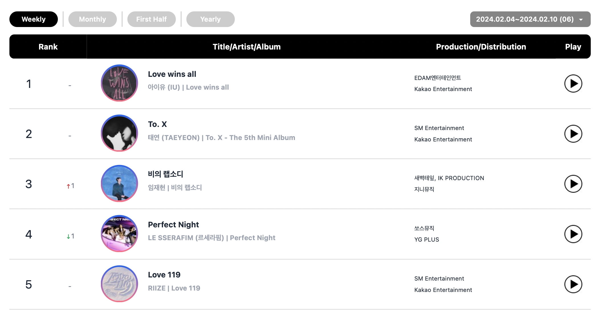 本周整体数字排行榜和流媒体排行榜上的前五名歌曲完全相同:IU的《Love wins all》排名第一,少女时代泰妍的《To》排名第一。第 2 名是《X》,第 3 名是林宰贤的《悲伤狂想曲》,第 4 名是 LE SSERAFIM 的《Perfect Night》,第 5 名是 RIIZE 的《Love 119》。
