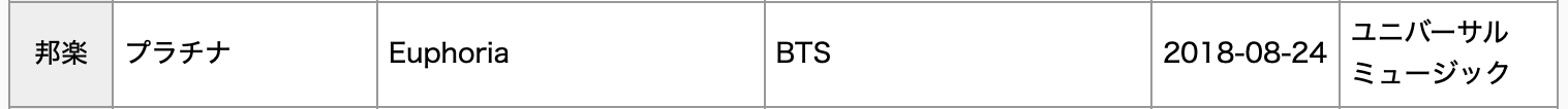 在 RIAJ 新公布的一批认证中,BTS 凭借田柾国的个人歌曲《Euphoria》获得了白金认证,该歌曲收录在该团体 2018 年专辑《Love Yourself: Answer》中。