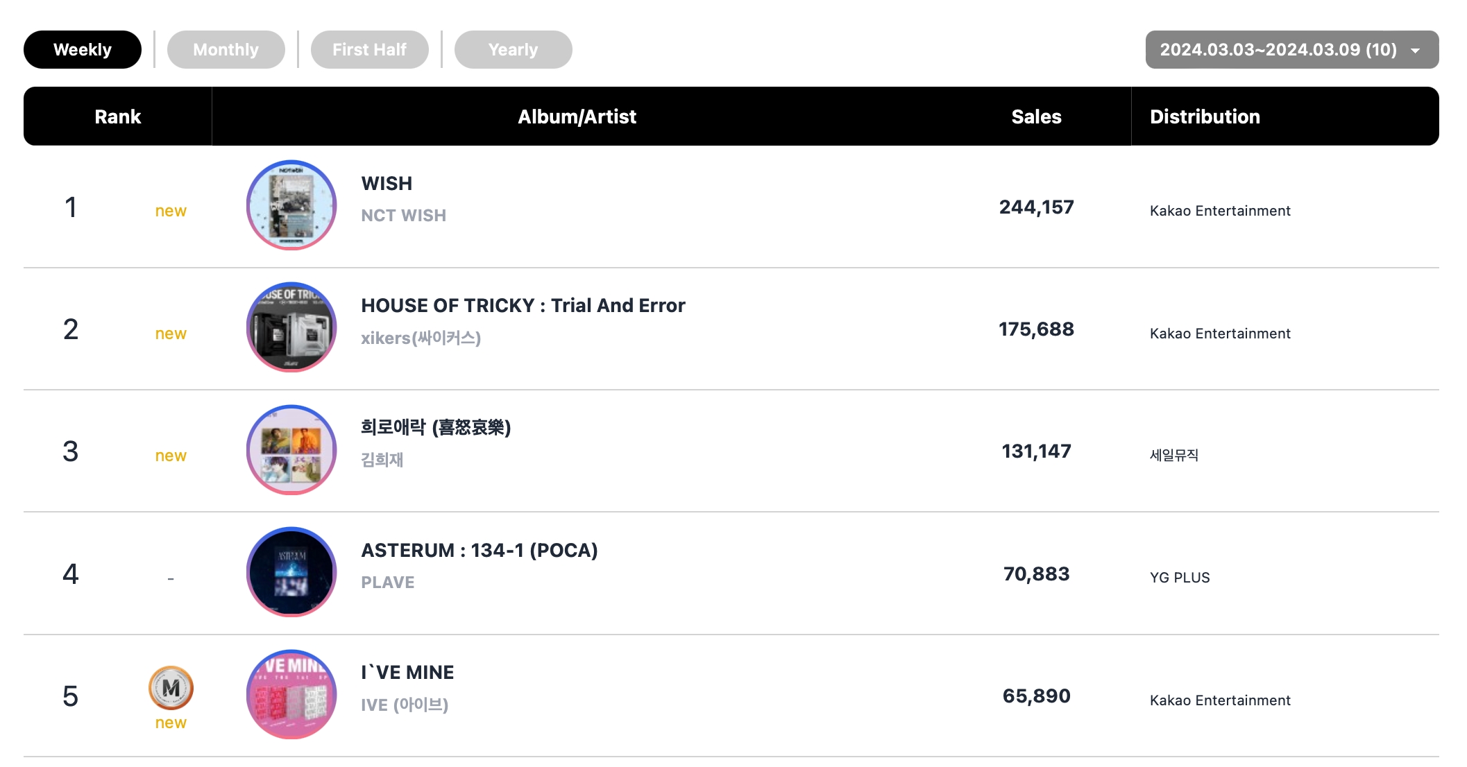 NCT WISH凭借出道迷你专辑《WISH》登上本周实体专辑排行榜榜首,并排名第一。