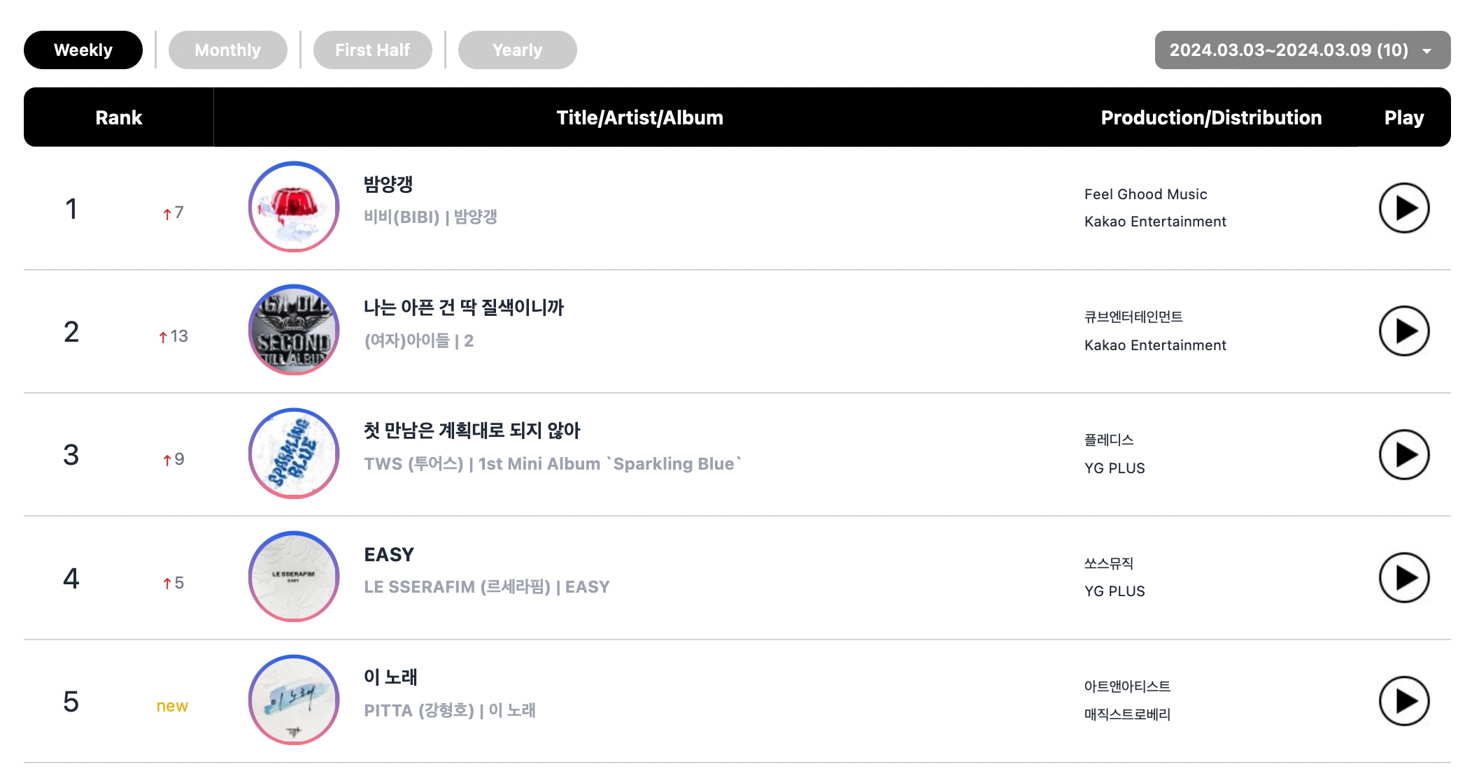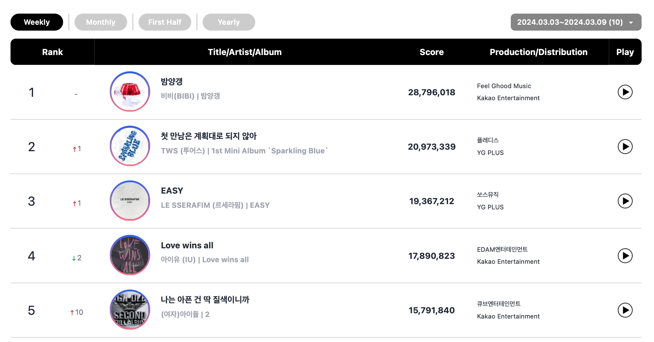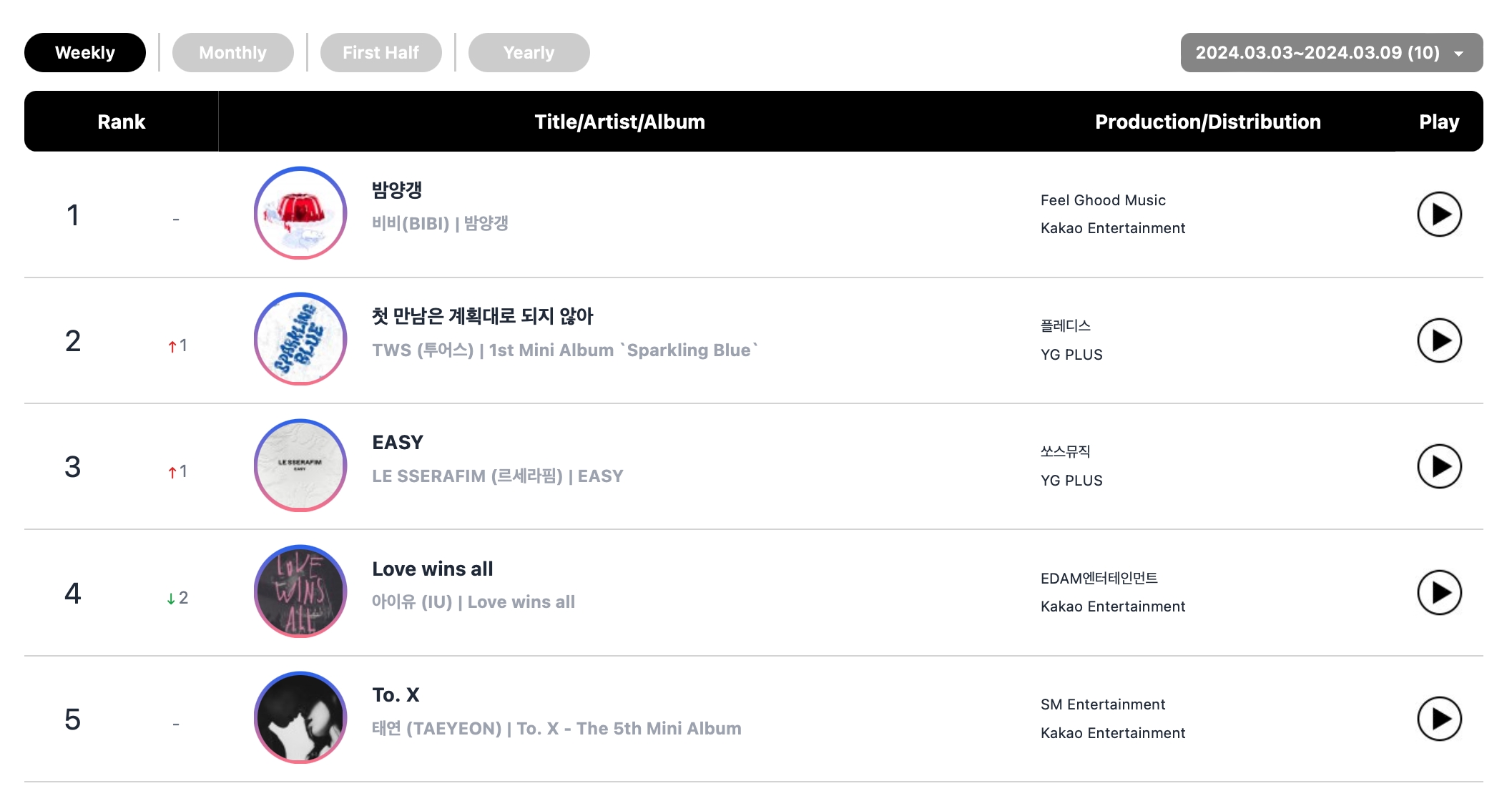 Circle Chart(原名 Gaon Chart)公布了 3 月 3 日至 9 日当周的排行榜!