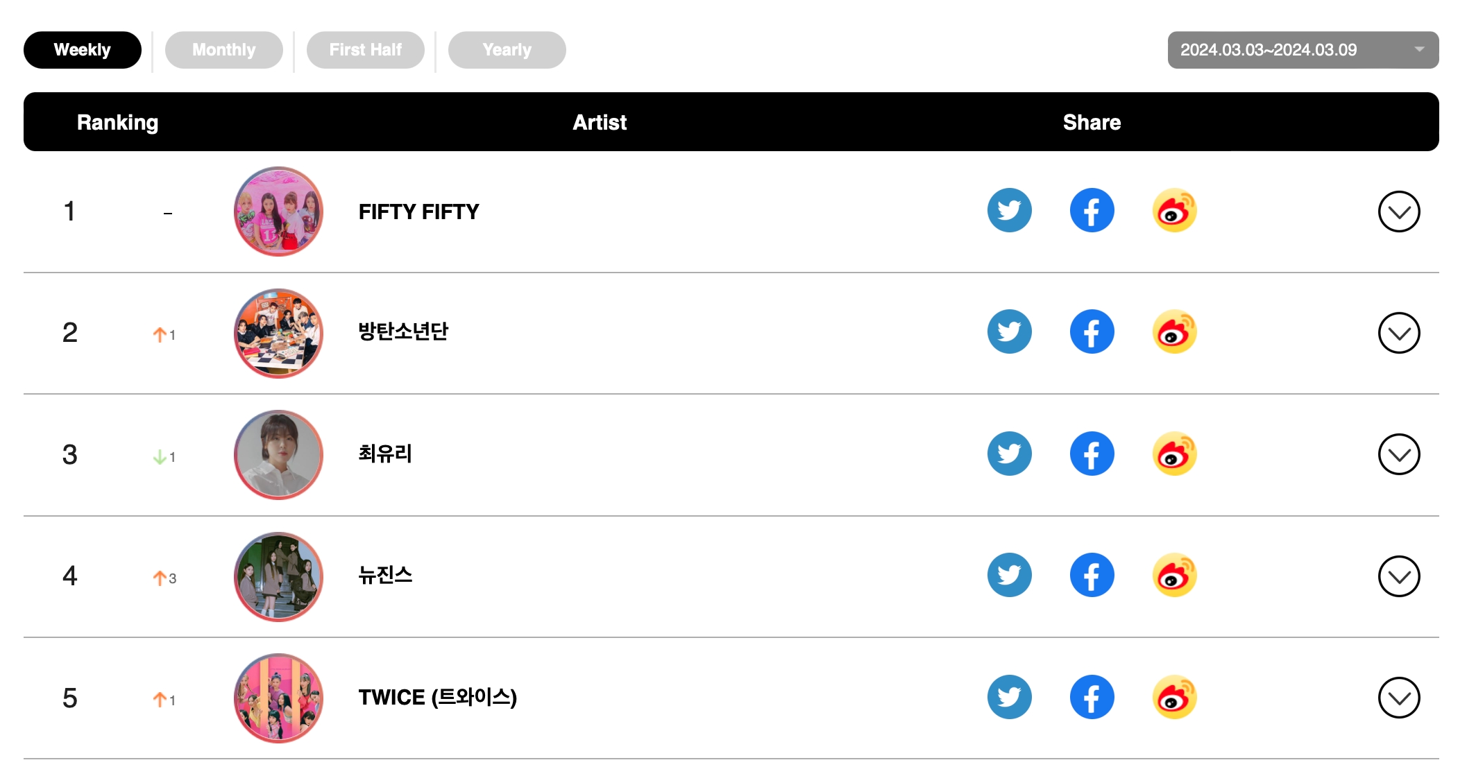 FIFTY FIFTY 本周在社交排行榜上仍然排名第一,其中 BTS 排名第二,Choi Yu Ree 排名第三,NewJeans 排名第四,TWICE 排名第五。