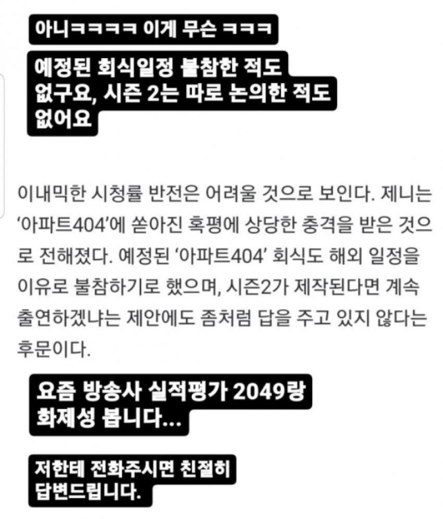 报导出来后,也引起许多讨论,让《公寓404》制作人丁哲民PD忍不住截图新闻后,亲自在个人 IG 回应「不是ㅋㅋㅋㅋ这是什么啊ㅋㅋㅋ (Jennie)没有缺席预定的聚餐,也没有另外讨论过第二季」,接着表示「最近放送公司的实际评价都是看2049跟话题性… 如果打电话给我的话,我会亲切地回復您」,反驳韩媒的推测性报导。