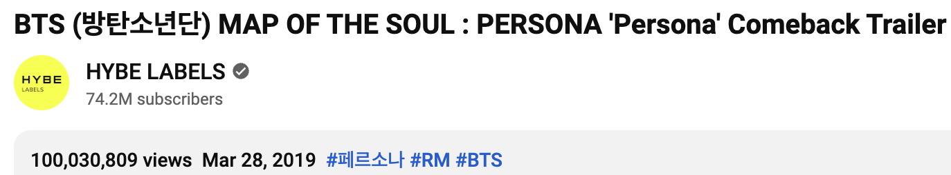 防弹少年团的《MAP OF THE SOUL : PERSONA》回归预告片以 RM 的独奏曲目《Persona》为特色,于 3 月 21 日韩国时间下午 6:30 左右观看次数突破 1 亿次。自 2019 年 3 月 28 日中午 12 点(韩国时间)发布以来,已经过去了大约 4 年 11 个月 22 天 18 小时。