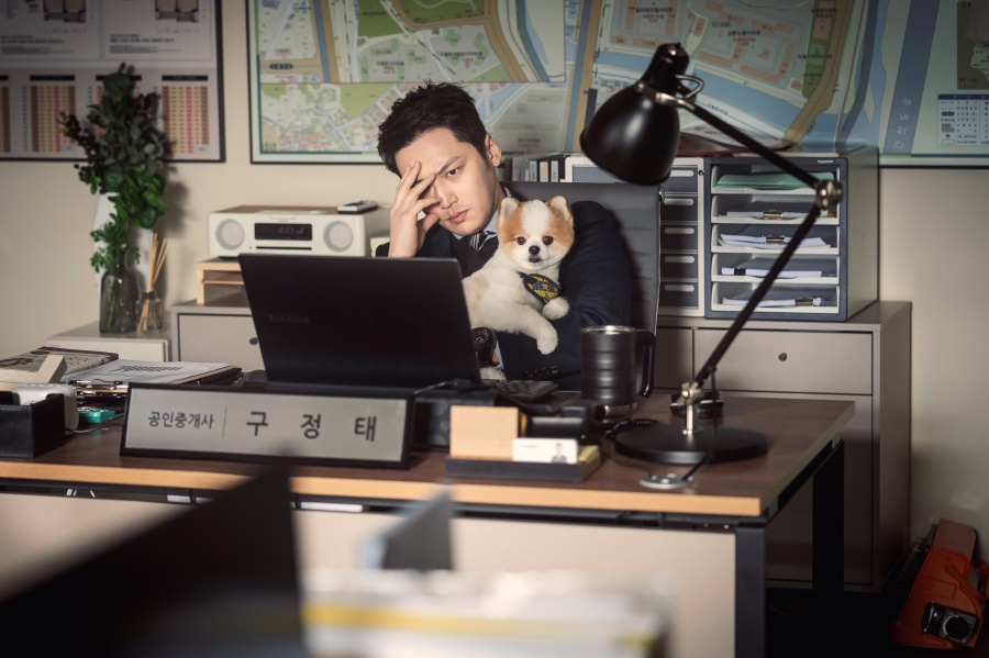 新发布的剧照展示了每个角色的个性和叙述。具正泰手臂上抱着一只小狗,盯着房地产办公室的监视器。