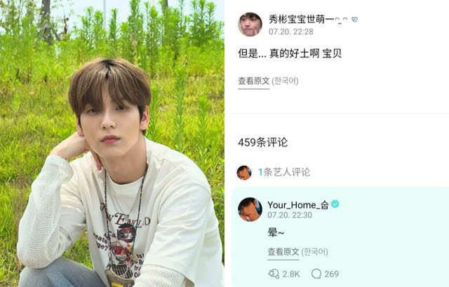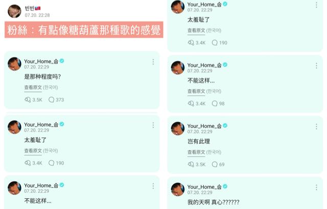 有台湾粉丝接着留言和他解释:「有点像是《糖葫芦》那种歌的感觉」,秀彬才开始大崩溃,连环炮回覆:「 oh my god 真心的吗?」、「岂有此理」、「不能这样…」、「太羞耻了」、「真的是那程度吗? 」,超激动的模样可以看出他真的感到很冲击!还有粉丝说:「真的好土啊」,引来秀彬回覆一句「晕~」,反应让粉丝直唿实在是太可爱啦!