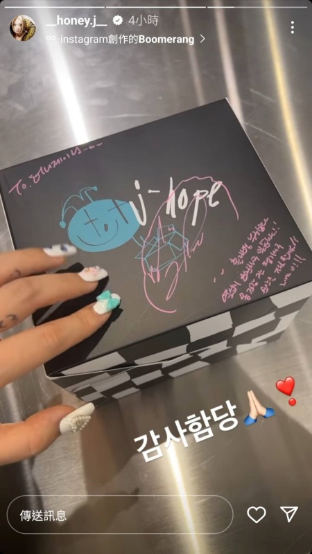 8日 Honey J 在 IG 上传一则限时动态写下「谢谢啊」,只见照片里竟然是世界级天团 BTS 舞蹈队长 J-hope 送的亲笔签名专辑,上面还写着「我一直都在为 HolyBang 应援!希望妳照顾好身体,为妳的顺产祈祷!Love u!」