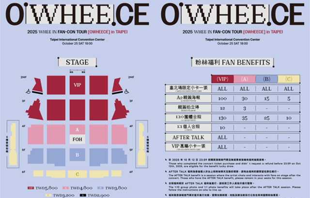本次粉丝演唱会票价分为5800元、4800元、3800元、3200元,购票者皆可获得一张臺北场限定小卡。其中,购买5800元票价者将获得VIP专属小卡一张,还能参与 AFTER TALK 并有机会抽1对1合照、1对10合照、亲签海报及亲签拍立得等福利。购买4800元票价者有机会抽1对10合照、亲签海报及亲签拍立得等福利,购买3800元及3200元票价者则有机会抽1对10合照及亲签海报。