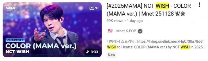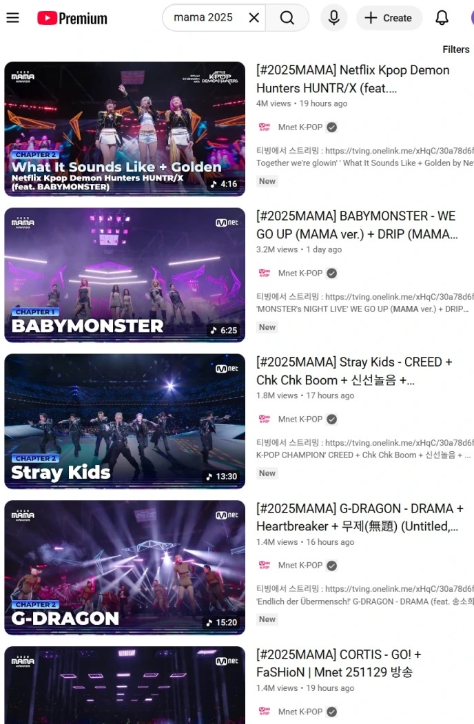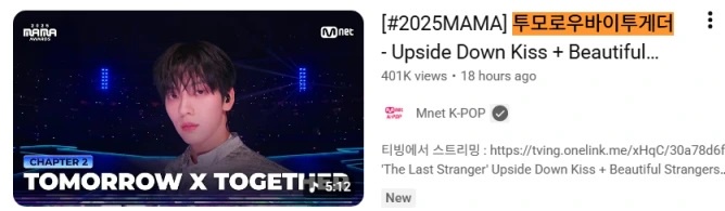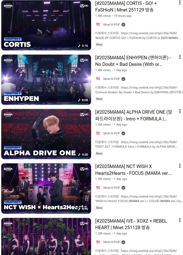 Mnet官方YouTube频道也上传了这些舞台影片。从播放次数来看,BABYMONSTER的反响度最高,截至11月30日16时为止,她们包办了第1名与第2名。