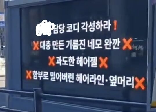 不过最近,在首尔街头出现了一辆非常不寻常的抗议卡车。它的LED萤幕上并没有出现典型的诉求,而是写着:「XX的造型师,睁开眼睛」,后面还搭配图像化的示意,展示粉丝希望偶像能尝试的髮型类型。