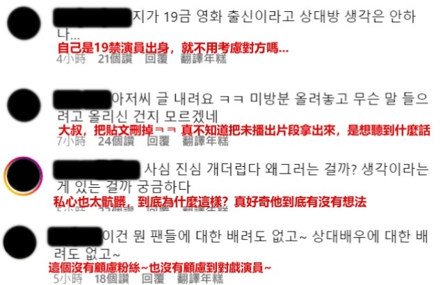 许多网友在留言区怒批「自己是19禁演员,就不用考虑对方吗…」、「大叔,把贴文删掉ㅋㅋ 真不知道把未播出片段拿出来,是想听到什么话」、「私心也太骯脏,到底为什么这样?真好奇他到底有没有想法」、「这个没有顾虑粉丝~也没有顾虑到对戏演员~」等,但也有部分网友认为只是很普通的亲密戏,不知道为什么要这样大惊小怪,引起两派的争论,大家觉得呢?