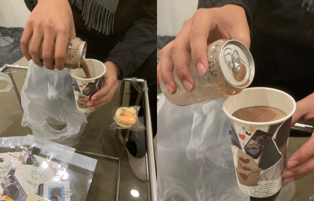 这位网友表示「各位一定要跟知道 K-POP 的朋友一起去生日咖啡厅…我拉着不认识偶像的朋友一起去生日咖啡厅,结果受到了冲击…在拍周边商品的时候…因为害怕周围的 NCTzen(官方粉丝名)用枪瞄准我,所以我只好藏起来了」,接着放了几张友人将饮品倒入印有 NCT 志晟图片纸杯的照片,对于把偶像周边当作宝物的粉丝们来说,简直是一大冲击。
