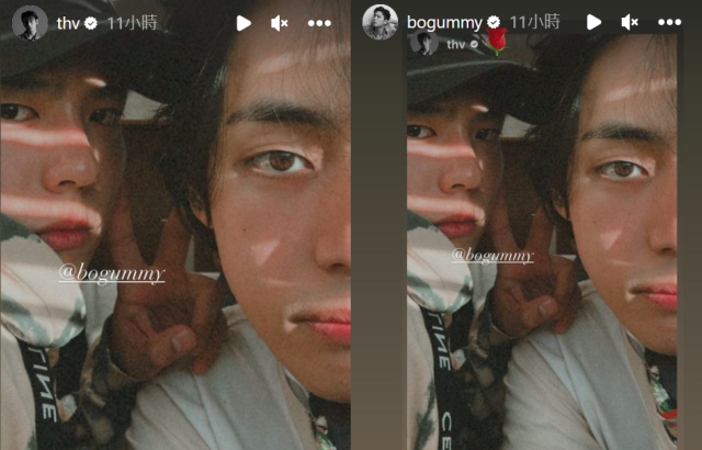 27日,V 于个人 IG 限时动态上传超近距离自拍,V 顶着随意的髮型,几乎贴在镜头前只露出面无表情半脸,朴宝剑则是稍微往后,戴着鸭舌帽靠在 V 的旁边,同样面无表情比出 YA 的手势,重点是两人似乎都是大素颜,但竟然还是毫无瑕疵,帅度破表,尤其是 V 浓密的眉毛,吸引了众人视线,朴宝剑随后也转发了这张照片,不过朴宝剑这张怎么有点小鸟依人的感觉(?!)