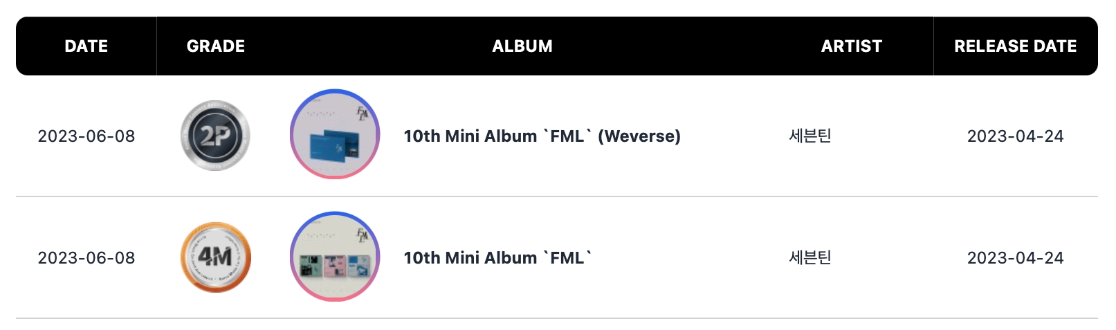 6 月 8 日,Circle Chart 宣布,SEVENTEEN 的最新迷你专辑“FML”销量超过 400 万张,首次获得四百万张认证。