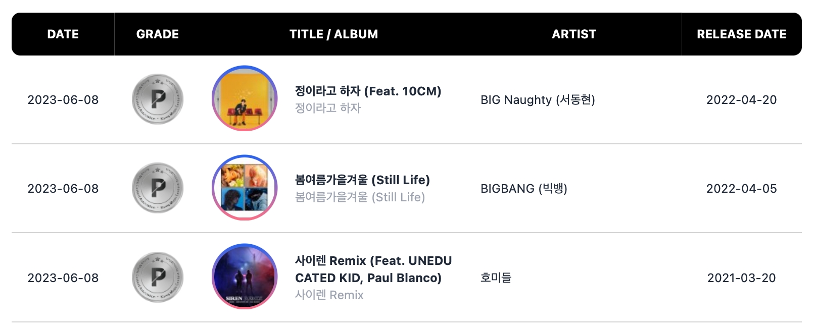 最后,在流媒体类别中,BIGBANG 的“Still Life”、BIG Naughty 的“Beyond Love”(主打 10cm)、Homies 的“Siren Remix”(主打 UNEDUCATED KID 和 Paul Blanco)均在突破 1 亿流后获得白金认证每一个。