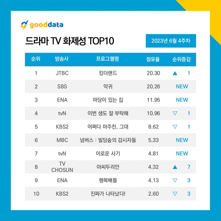播出第二周,《King the Land》在 Good Data Corporation 每周最热门剧集排行榜上跃居第一。该公司通过从新闻文章、博客文章、在线社区、视频和社交媒体收集有关当前正在播放或即将播出的电视剧的数据来确定每周的排名。