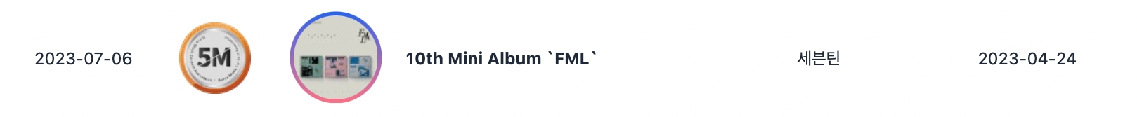 7 月 6 日,Circle Chart 为 SEVENTEEN 的最新迷你专辑《FML》颁发了有史以来首个五百万张认证,该专辑在 6 月底前销量超过 500 万张。