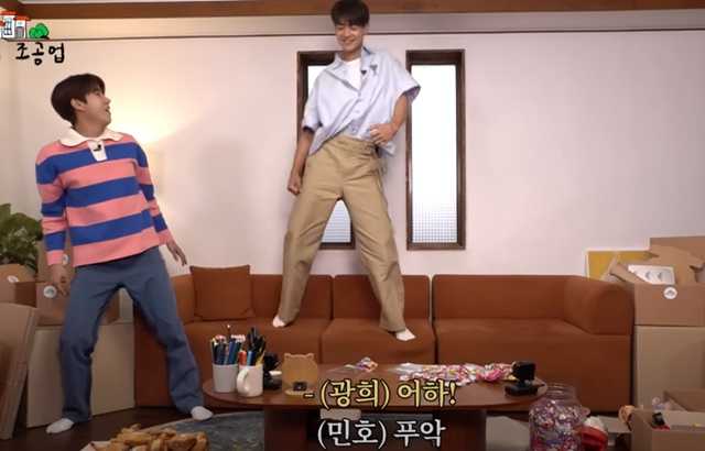 一开始,光熙欢迎珉豪参加节目,并开心说道「欢迎你来,其实你是我的前辈偶像」,珉豪问「怎么说呢?」光熙说「因为你是SHINee」,珉豪不满的说「你总是这样,只在大家面前才这样做」,光熙一听连忙拉着珉豪的手说「欢迎尊敬的前辈加入」,两人笑成一片。