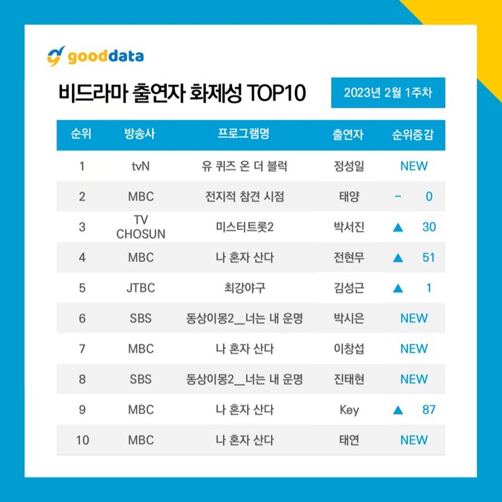 MBC 的“小鬼当家”(“我独自生活”)在最受关注的节目榜单中攀升至第 4 位,在本周的前 10 位出场次数中也包揽了 4 位:全炫茂排名第 4,其次是 BTOB 的 Changsub 排名第 7,SHINee 的 Key 排名第 9,少女时代的泰妍排名第 10。