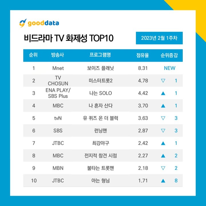 在 2 月 2 日首播后,“男孩星球”——“女孩星球 999”的男性版本,该项目催生了女子组合 Kep1er——在最受关注的非戏剧类节目排行榜上排名第一电视节目。