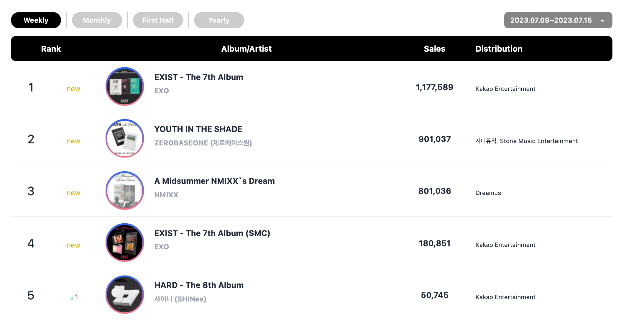 ZEROBASEONE的首张迷你专辑《YOUTH IN THE SHADE》进入排行榜第2位,紧随其后的是NMIXX的新单曲专辑《A Midsummer NMIXX’s Dream》位居第3位。
