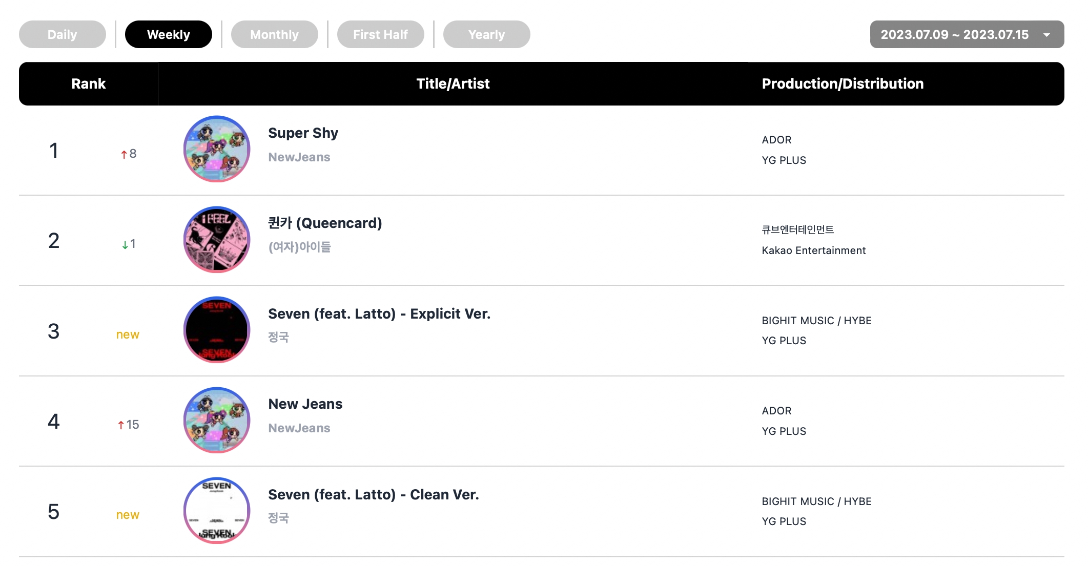 NewJeans 的《Super Shy》在本周的全球 K-Pop 排行榜上升至第一名,而他们的另一首预发行单曲《New Jeans》则跃升至第四名,(G)I-DLE 的长期热门单曲《Queencard》保持在第二名的强势地位。