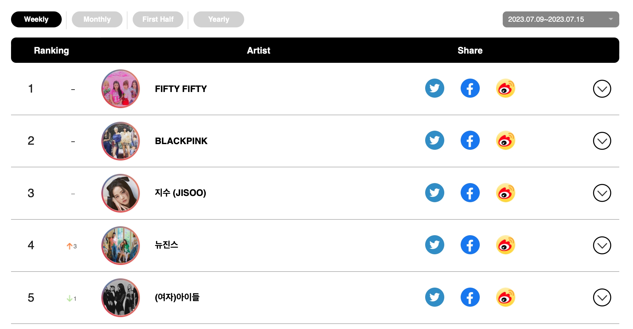本周社交排行榜上的前三名艺人与上周相同:FIFTY FIFTY 仍然排名第一,而 BLACKPINK 和 BLACKPINK 的 Jisoo 分别排名第二和第三。